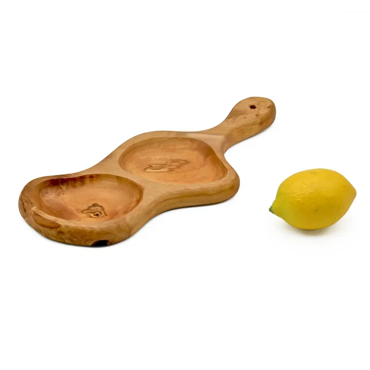 オリーブ特有のダイナミックな木目が存分に楽しめる手付きのレイプレートです。 裏はフラットなのでカッティングボードとしてもご使用いただけます。 古くからヨーロッパや地中海沿岸地域で愛されてきたオリーブの木は、実用性と美しさを兼ね備えた高級木材。 油分が多く水はけがよいため、食器やキッチン用品に適しています。 また、数百年という長い年月をかけて生まれる密度の高い年輪やダイナミックな節、ユニークなマーブル模様は唯一無二であり、その華やかな見た目は食材や料理を美しく演出してくれます。 【高品質なオリーブで知られるMéditerroir社の製品】 本製品を生産しているのは、チュニジア北東部の町、Menzel Kamelに拠点を構えるMéditerroir社。自社のオリーブ農園を保有し、オーガニック認証を受けた高品質なオリーブオイルをヨーロッパやアメリカなど、世界各国に輸出しています。 本製品は、そんなM'diterroir社が抱える熟練の職人たちが自社の高品質なオリーブの木を使って手作りしています。 【オリーブウッド製品の持続可能性】 チュニジアではオリーブの木の伐採に関するルールが厳格に定められており、基本的にオリーブの実をつけなくなった樹木しか伐採して使用することができません。 さらに、オリーブの木を1本伐採するごとに、新しい苗を1本植えなくてはならないという決まりもあります。 Méditerroir社のオリーブウッド製品は、オリーブ農園での役割を終えた樹木を使っているため、自然の恵みを無駄にしないエシカルな商品だと言えます。