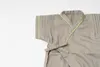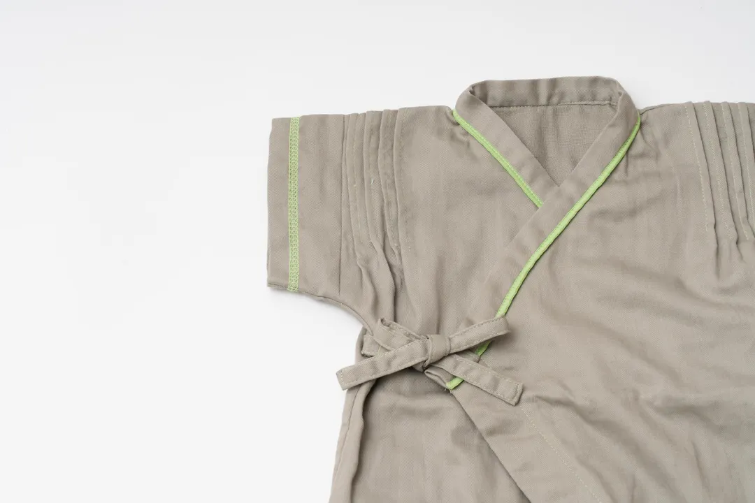 ASAMIDORI(アサミドリ) 春の訪れを感じさせる新緑の色「浅緑」に、静かな薄曇りのグレーを重ねる配色。自然の移ろいと生命の芽吹きを象徴。「浅緑」は古来、日本で“若葉の希望”を表す色として平安時代から用いられてきた色です。 テーマ Quiet growth ― 静けさの中の芽吹き 都市と自然のあわいを生きる現代の親子に寄り添う、透明感のあるイメージでお作りしています。 甚平は和装のホームウェアのひとつ。 甚平は江戸末期に庶民が着た袖無し羽織で暑い夏の暮らしを少しでも快適に過ごせるように工夫された着物です。 水と蒸気の力でゆっくりと不純物を取り除き、綿本来のやわらかさを引き出す日本の伝統技法「和晒(わざらし)」で丁寧に仕上げた国産ガーゼを使用し、赤ちゃん向けのロンパースをお作りしました。 軽くて通気性がよく、汗をかきやすい季節にも快適。 前開きのデザインでお着替えやおむつ替えも簡単です。 縁はふんわりとしたウーリー糸で仕上げ、柔らかな印象の中に上品さを添えています。 動きやすく、寝返りやはいはいの時期にも自然にフィットする形です。 サイズ:丈47.5cm x 身幅30cm(一周60cm)