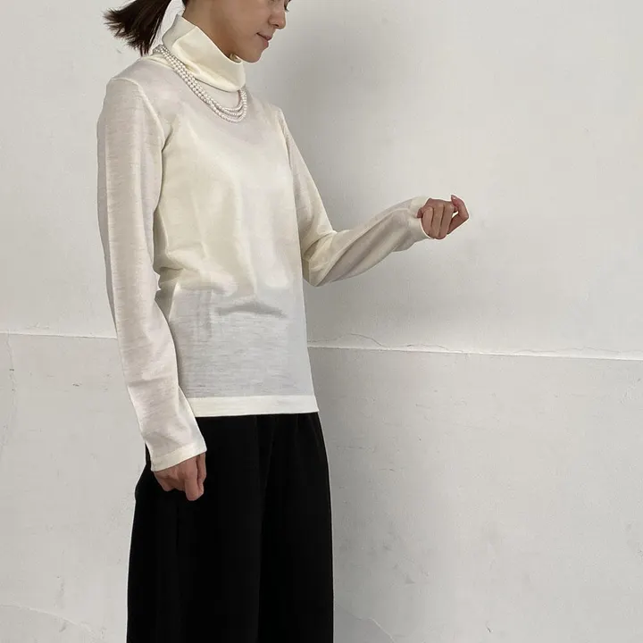 【日本製】ウォッシャブルウール_ハイネック長袖ウール オフホワイト 1-2サイズ