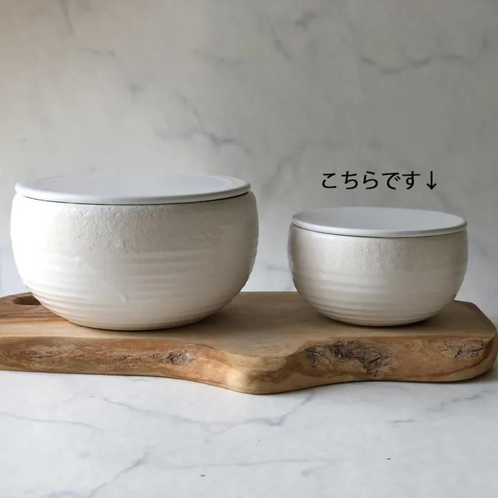 シックで使いやすいおひつです。 炊き立てのご飯をおひつに保存しておき、冷めてしまったら電子レンジで温めが可能。 フタがフラットで重ねやすい形状です。 多孔質土の無数にある細かい気孔が、ご飯の水分を吸収したり、放出したりして水分調整を行い、 ごはんの乾燥を防いでもちもちの美味しいご飯を保存できます。 陶器のお櫃はご飯の臭いを吸収し、黄ばみも臭いも防いでくれるので、風味を損なわない美味しいご飯が保存できます。 また木製と違い、カビにも強く、お手入れも簡単なのが特徴です。 おひつごとレンジで温めることができ、いつでもふっくらモチモチ炊きたてご飯をよみがらせてくれます。 サイズは1合または2合、それぞれに白と黒のラインナップです。 【 土物製品の特徴と使用上の注意 】 多孔質土は吸水性の高い土を使用した硬度の低い物が多くあります。 ご使用につきましては以下の点にご注意下さい。 * 食品の入ったまま長時間放置しないで下さい。シミ・におい移りの原因となります。 * ご使用後はすぐに洗浄し、水分を良く拭き取った後十分に乾燥させて下さい。   臭いやシミ・カビの原因になります。
