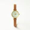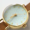 アマゾナイト(和名:天河石)という天然の鉱物を砕いて作った「岩絵具」を文字盤に塗った腕時計です。 「岩絵具」は、日本画を描く際に用いられ、7世紀ごろ高麗の僧が紙や墨とともに日本へ伝えたといわれている、 主に天然の鉱物を砕いて作る絵具です。普通の絵具にはない、透明感ある色彩と、粒子が粗くザラザラとした独特の質感をお楽しみいただけます。 ■ベルトサイズはレディース(手首周り15-16cm対応)を基準に制作しています。 【仕様】 ■素材 / 時計本体(日常生活防水):ステンレス、強化ガラス ベルト:牛革、ステンレス ■サイズ / 文字盤:直径22mm(リューズ部分含まず)、厚さ7mm、幅約0.7cm ベルト:内周約13.5~17cm(7段階調節可能) ※ベルトを含む腕時計の重量:約12g ※ベルトの色:No.39 シナモン ※ムーブメント:クオーツ式(セイコーエプソン社製、国産) ※保証書付き(一年間) ※ベルトは、レディースサイズ(手首まわり14.5~16.5cm)を基準に製作しています。 ※文字盤は天然素材を使用し、手作りですので個体差があります。 ※ベルトは、本革のため、表面に独特のしわや凹凸、多少の傷・光沢・色ぶれ・色むらなどが出ることがあります。