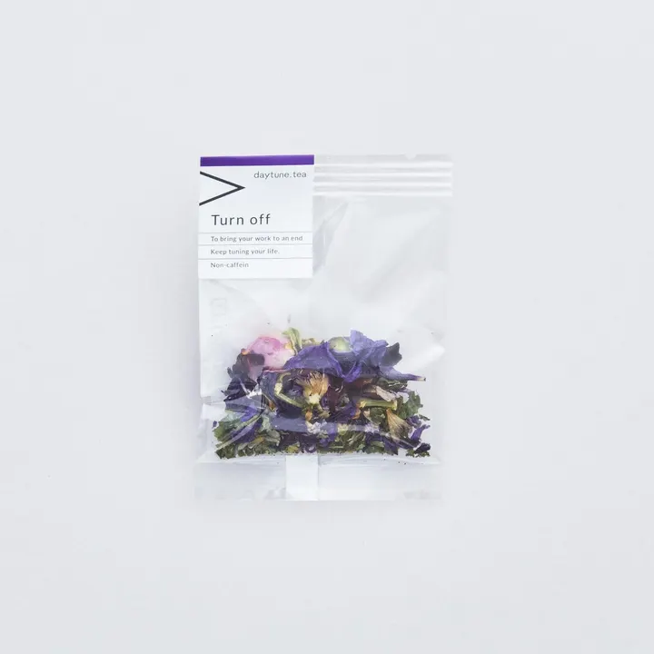 ローズやブルーマロウのアントシアニン色素により、淹れた直後は青色で、次第に茶色に変わっていきます。ローズやラベンダーの華やかで穏やかな香り、スペアミントとレモンバームのすっきり感が、あなたのモードをだんだんとオフにしてくれるハーブティーです。 ・終えるためのブレンド Turn offブレンドは、終える時間をきちんととるための、優しい味の薄茶色のティー。バラ、ラベンダーの上品な華やかさ、フローラルな香りを活かしたブレンドで、品のある香り高さを求め、有機・農薬不使用で丁寧に育てられている国産のバラ、ラベンダーを使用。 甘く優しいスペアミントと爽やかな香りのレモンバームもアクセントにプラス。 ダマスクローズのつぼみで香り、見た目の可愛らしさも演出。バラ・コモンマロウのアントシアニンの働きにより、驚くほど美しい青色から灰色へと、夜が深まるように色が変化していきます。この贅沢なブレンドは、見た目も香りも素晴らしく、一杯飲めばリラックスできることでしょう。 ・素材へのこだわり Turn offブレンドでは花を主役として使用しているが、花は香りや色が抜けやすいため、特に品質にこだわり、丁寧に作られたものを厳選。バラは、紅茶のような品の高い芳しさのある「さ姫」というブランドの高級品を使用。 ラベンダーは「ラベンダートゥルー(真のラベンダー)」と呼ばれる、わざとらしさのない香り高さのある品種を選んでいます。優しい香りが特徴であるが故に、品質が低いと香りや味が薄くなってしまうスペアミント・レモンバームは静岡県の新鮮で丁寧にドライをかけたものを使用しています。 ・オフモードにしたい時に 今日は、ここまで。このままだと寝落ちるまで仕事をしてしまいそうだから、パソコンを閉じて席を立ち、ティーを淹れなおしてソファに腰掛ける。まだやりきれてないこともあるけど、できたこともたくさんあるわけで。 今日の会議、準備をしっかりして臨んだから良かったな。誰が褒めてくれるわけでもないけど、自分だけは自分を褒めてあげられたら。うん、たしかに頑張った。明日に向けて元気をチャージしたいし、仕事を忘れて読書でもしよう。 〈ティーバッグについて〉 daytune.では、素材にもこだわってプロダクトをつくっています。ブレンドしているハーブについては有機・農薬不使用のものを代表自らが一つひとつ、味や品質を吟味して選定。ティーバッグは、生分解性成分であるトウモロコシ由来のソイロンを素材としたものを使用しています。 土に還せるのはもちろんのこと、燃やしても有害な物質が出ません。環境への配慮になるだけでなく、ティーもより本来の味が楽しめます。daytune.が持続可能性を大事にするブランドであるために、できることから取り組んでまいります。