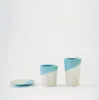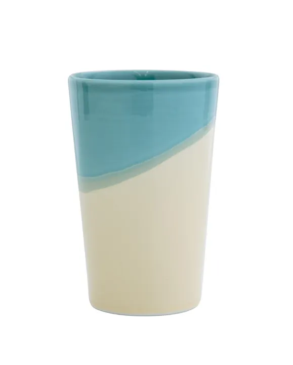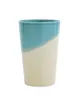 魔法瓶の仕組みを応用した中空二重構造のタンブラー『キーポ』とCDFのコラボ企画です。 冷たい温かいをながーくキープしてくれる、磁器製としては珍しいダブルウォールタンブラー。 詳細画像にある断面の画像をご覧ください! 2色の斜め塗分けは私どものデザイン。 お茶やジュース、ビールなどなど、これからの季節爽やかに使っていただけます。 製造工程上、内側に釉薬のムラが出る場合がございますが、手作りならではの風合いとしてお楽しみください。