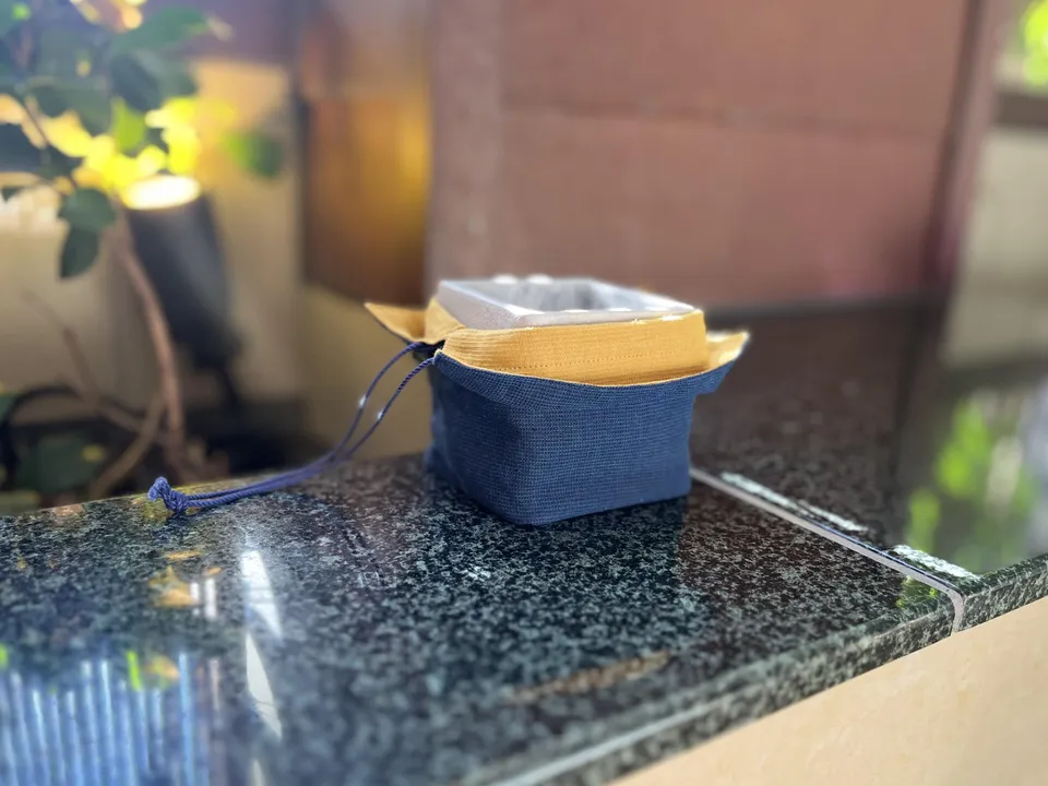 ※こちらの商品には植物はついておりません。 ----------------- 碧のおくるみについて 保多織のこと その名は「多年を保つ」との事から、保多織と命名され江戸時代(1686年)から高松に伝わる、とても軽くて丈夫な香川県伝統工芸です。 カタンコトンと織る音色が独特の美しい凹凸を生みだし、通気性、吸水性、保温性を実現したやさしい肌ざわりの織物です。 岩部保多織本舖 岩部保多織本舗、創業120余年。香川県指定の伝統工芸士・岩部家4代目・岩部卓雄。 伝統工芸の技術を用いて「様々なニーズに対応しながら受け継いでいく。」と一つ一つ職人の丁寧な手仕事によって織られています。 ----------------- カラー:ネイビー×イエロー サイズ:約8cm×約9.5cm 材質:保多織/綿 植物鉢・受け皿/セメント 付属:受け皿 ※職人による手作業のため、サイズや色味において多少個体差がございます。