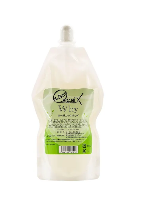 しなやかにまとまりやすい髪を目指す方におすすめのヘアケアローションです。 毎日のヘアケアにコツコツ使うと、髪にうるおいを与えツヤやかに整えます。 においもほとんど残らないので、朝昼晩いつでも使いやすい♪ ストレートヘアの方や、髪を染める方に、リピート購入されています。 ❝ なぜ? ❞ ❝ なぜ? ❞ が多い商品なので、why(ホワイ)という商品名にしました。 《なぜ、そうなるのか》は企業秘密ですが、以下は事実の広報です! ①ヘアカラーで傷んだ髪でも、髪が"やわらかくしなやか"になって、カラーの色モチも良くなり、ヘアのお手入れが快適になります。 ②ブローやアイロンでスタイリングする時は、原液または水道水で倍に薄めた液を髪全体に塗布しておくと、髪の傷みを予防し、"ツヤと手ざわりと風あい"が良くなり、オシャレのグレードがあがります。 ③ツヤや手ざわりを良くする原材料に使ってないのに、本品を使い終わる頃には、"ツヤと手ざわりと風あい"が良くなっていて、アカ抜けた爽やかな髪美人になっているはずです。 ④寝ぐせ直しには、原液を水道水で2~3倍に薄めてスプレー式の容器で、髪全体に霧状に軽くかけた後は、従来の方法でスタイリングする。 この繰り返しで髪の質感は次第に整い、髪美人になっていきます。 ⑤髪につける時は、粘度があってヌルヌルしていますが、乾けばヌルヌルやベタつきはなくなり、サラサラの爽やかなオシャレ髪になります。 ⑥ヘアカラーの時に、Whyの原液を頭皮と髪全体に塗布しておいて、カラー剤に大さじ1杯分の原液を混ぜてカラーリングすると、頭皮と髪の傷みを防ぎながら、カラーの「色味」と「色もち」と「ツヤ・手ざわりと風あい」と「髪の手入れ性」を良くすることができます。 ⑦どんなに傷んだ髪や硬毛でも使い続けると、やわらかくしなやかな髪になっていきます。 (張り・コシ・ボリュームが欲しい方は、弊社のジェルシャンプーとジェルコンディショナーと、仕上げ料にSSローションα1の使用をお薦めします) 上記のような結果にならない時は、使用法か量・・・・・・など、何か原因がありますから、遠慮なくオーガニック(株)までお申し出ください。 【特長】 ●自然なツヤ感(スタイリング料をつけてます!感が無い) ●重ね付けできて、重さと軽さのバランスが良く、ちょうどいい手ざわり (重めのヘアスタイルが良い場合は、少し物足りないかもしれません) ●使い続けると髪の質感が整っていく! ●乾いたらべたつかず、匂いも残らない。 ●手に付いても水で洗えば3秒くらいでスッキリ、もし手が洗えなくても乾けば気にならないくらいのあっさりした感触のヘアローションです。 唯一の欠点は・・・セット力が無いので、固まらないことです。 ですが、そちらのほうが良い!という場合もありますので、髪にツヤと手ざわりと風あいをお求めの方におすすめです。 (セット力が欲しい方は、SSローションα1 (アルファワン)や、SSローションα (アルファ)をお使い下さい) 【どうやって商品化になったの?】 ヘアカラーをよく使用される方、理美容室の方にも、何度もリピート購入していただいている「Why」です。 なぜ?なんでこんなに髪がきれいになるの?という、なぜ?からWhy (ホワイ)という名前をつけました。 弊社のパーマに使われているヘアローションから派生して登場した商品です。 それまでは、弊社商品には、セット力のあるヘアローションしかなかったのですが、若いお客様で、パーマをかけない方が増えたり、ヘアカラーが流行したこともあり、そのようなお客様に対応できるヘアローションがあったらいいなということで商品化されました。 ぜひ、なぜ?なぜ?なぜそうなるの!? を体験してみてください! 自分の髪を美しくしたい方、お客様の髪をもっと美しくしてあげたい理美容師さま、使ってみて下さい。 まずは、Why400mLを1本使い切ってみてからご判断を。 (途中で他のスタイリング料を使うと効果がわかりにくくなりますので、これを使いだしたら続けて使ってみて下さい。) 欠かせない商品になる自信ありです! ※ショートヘアのセット時の使用目安量は、500円玉大くらいです。使用量は多い方が、指通りが良いです。