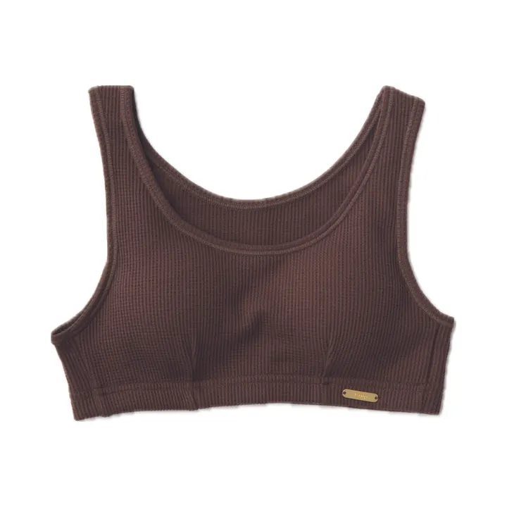 お休みの日や家でゆっくりとしたい時にぴったりなハーフトップ。 締め付けが少なく、ゆるっと楽に着られるので、身体をリラックスさせて過ごすことができます。 Cuip ズボパンと合わせて、ルームウェアとしてご利用ください。 胸元がしっかり隠れ、肩紐部分も太めのデザインになっているので、くいこみにくく、安定感のある着心地に。 パッドは取り外し可能なので、お好みのものとの入れ替え、自分にフィットしやすく着られます。 身生地に使用している生地は、ワッフルのようにマス目状の凸凹のある生地で、やわらかく、身体を包み込んでくれるような優しい肌触りです。