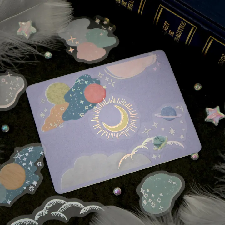 【 キラキラクリアシール Planets 】 ★★キラキラマステのフレークシール版!  箔押しが魅力の「キラキラマステ」をクリアタイプのフレークシールとして 新たにシリーズ化した【キラキラクリアシール第3弾!】 『 レインボーオーロラ箔 』 による、8柄展開★★ 惑星たちを囲む雲の運河や数々の輝く星たち… 見るだけで惹きこまれてしまう幻想的な惑星の世界を、 『レインボーオーロラ箔』で表現しました。 ノートやカレンダーの端に貼ったり、ファイルケースや瓶・クリアボトル など、いろんなものを可愛くデコレーションできちゃいます♪ PET素材ならではの【透明度×やわらかさ×粘着】が 紙素材へのデコレーションだけでなく 身の回りの小物デコレーションにも馴染みます♪