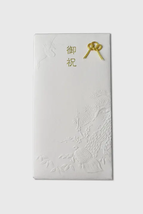 【伝統工芸士コラボ】エンボス多当 伝統工芸士の結ぶ水引と縁起物エンボス加工を楽しむ金封 えひめ伝統工芸士の水引職人、村上三枝子氏に水引を結んでいただいた美しい多当金封です。上品なゴールドで熨斗部分に結びを作っていただきました。 エンボス加工には当店で創業当時から使われている、今では手に入れることのできない大変貴重な版を使用しました。 「御祝」の文字はマットゴールドで箔押し、立体感を出すためにエンボス加工を施しています。ひと工程手間を加えることで高級感のある美しい仕上がりになるようこだわりました。 本体には柔らかな手触りと漂白していない自然な色の奉書紙を使用しています。 多当折になっているので封筒を使用する時より少し改まった時や金額の多い時に使用することができます。 ●宝船 大変人気の「宝船」デザインです。 当時の職人が手作業で彫った版を使用しているので、波や亀の尻尾の線など凹凸が繊細に表現されています。 ●老松 「老松」のデザインは鶴亀と松竹梅をデザインした縁起の良いデザインです。 当時の職人が手作業で彫った版を使用しているので松の細い線や梅の木肌の凹凸が繊細に表現されています。 ●大竹 「大竹柄」と呼ばれる竹を中心として松竹梅が散りばめられた縁起の良いデザインです。 当時の職人が手作業で彫った版を使用しているので松の細い線や梅の木肌の凹凸が繊細に表現されています。