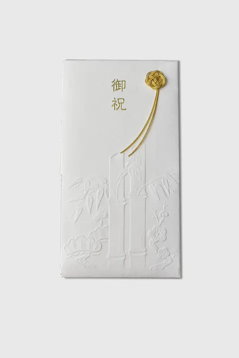 【伝統工芸士コラボ】エンボス多当 伝統工芸士の結ぶ水引と縁起物エンボス加工を楽しむ金封 えひめ伝統工芸士の水引職人、村上三枝子氏に水引を結んでいただいた美しい多当金封です。上品なゴールドで熨斗部分に結びを作っていただきました。 エンボス加工には当店で創業当時から使われている、今では手に入れることのできない大変貴重な版を使用しました。 「御祝」の文字はマットゴールドで箔押し、立体感を出すためにエンボス加工を施しています。ひと工程手間を加えることで高級感のある美しい仕上がりになるようこだわりました。 本体には柔らかな手触りと漂白していない自然な色の奉書紙を使用しています。 多当折になっているので封筒を使用する時より少し改まった時や金額の多い時に使用することができます。 ●宝船 大変人気の「宝船」デザインです。 当時の職人が手作業で彫った版を使用しているので、波や亀の尻尾の線など凹凸が繊細に表現されています。 ●老松 「老松」のデザインは鶴亀と松竹梅をデザインした縁起の良いデザインです。 当時の職人が手作業で彫った版を使用しているので松の細い線や梅の木肌の凹凸が繊細に表現されています。 ●大竹 「大竹柄」と呼ばれる竹を中心として松竹梅が散りばめられた縁起の良いデザインです。 当時の職人が手作業で彫った版を使用しているので松の細い線や梅の木肌の凹凸が繊細に表現されています。