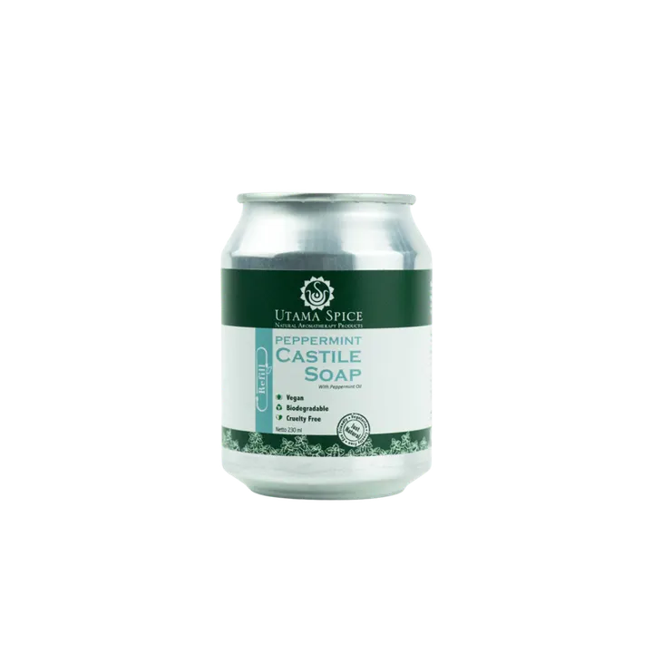 カスティールソープ ペパーミント の詰め替え用です。 環境をに配慮して、、リサイクル効率が高いアルミ容器を使用しています。 アルミ容器なので所々へこみがございます。 ご了承願います。 容量:230ml