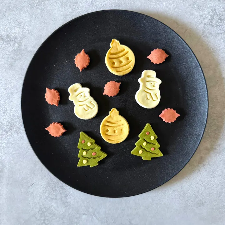 □米粉のクリスマスクッキー クリスマス限定! クリスマスツリー、オーナメント、雪だるま、ヒイラギの葉の かわいい形の米粉クッキーです。 Merry Christmas★ このシーズンだけの特別なクッキー、見た目も華やかなので プチギフトなどにもおすすめです。 ※小麦、卵、バター、砂糖、人工着色料は一切使用しておりません。 ※ペットの「食」の専門家であるペットフーディストが一つずつ丁寧に手作りしています。 ※注文が重なった場合、少しお時間いただく場合がございます。