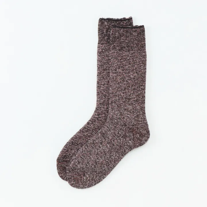 冬の足元に、きらめく「やすらぎ」を。 もこもこすやぁソックスが、ラメ糸を纏い、名も新たに「もこすやきらぁソックス」として登場。 肌側はおなじみのボアフリースのようなふくらみある編み構造。表側には、きらきらと光るラメ糸と、HOiSUMオリジナルのグラデーション糸を使用しました。 ささやかなひとときに、ほんのり“きらめき”をプラス。 足を通した瞬間、冷え知らずの温もりと、やわらかな安心感に包まれます。 ラグジュアリーに、だけど気取らず。 寒い外出先でも、自宅でのリラックスタイムでも、ベッドルームでも?? いつでも足元のおしゃれを忘れないあなたへ。 ※一本の糸にグラデーション加工を施した“絣(かすり)糸”を使用しています。 色味や光沢の出方には、個体差が生じる場合があります。