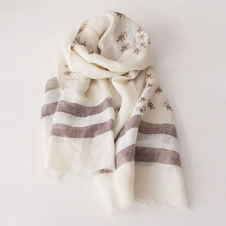 デリケートな首元にもチクチクすることがない上質リネンを使ったオリジナルのリネンストールです。上質で軽やかなリネンは、使い込むほどに柔らかく肌に馴染んでいきます。 ☑ コンセプト 「健康」「環境」「造り」をコンセプトにしたインテリアショップ自社開発のリネン製品 ☑ 天然素材100% 天然素材100%の高品質なアイテムを使いやすい価格で「リネン製品をもっと気軽に」 ☑ 低ホルムアルデヒド 定期的に国内でホルムアルデヒド検査を実施、お子さまからお年寄りまでからだにも環境にも安心 【オールシーズン使える上質リネン】 リネンって夏だけ?と思っている方はサラッとした肌触りながら、やさしい暖かさに驚かれると思います。 あたたかい素材のストールは気分じゃない・・・ 映画館や観劇で肌寒くなってしまう・・・ そんなときも、リネンストールなら重くなりすぎず、季節の変わり目にも重宝します。 もちろん、夏の室内での冷房対策や首元の日焼け防止にも。持ち歩くときは、バッグに結んでしまってもアクセントに。無造作にバッグにつっこんでもなぜかサマになります。 【デザイン】 ベースの裾に太めのラインをデザインすることで、上品な女性らしさに格好良さをプラス。リーフの刺繍は濃淡のある2色を組み合わせ、立体感を出しました。デザインと色が幾重にも組み合わさり、バランスのいい1枚になりました。 ■ブラウン ナチュラルなアイボリーをベースにブラウンのラインをデザイン。リーフの刺繍部分はライトブラウン×ホワイトの糸でランダムに縫い合わせています。 ■ブルー 爽やかなライトブルーをベースに、ブルー×グレー×ホワイトのラインをデザイン。リーフの刺繍はライトグレーとダークグレーをランダムに縫い合わせています。 ■グレー 柔らかいニュアンスグレーをベースに、ライトグレー×ホワイトのラインをデザイン。リーフの刺繍はウォームブラウンとベージュをランダムに縫い合わせています。 ■イエロー 安らげるベージュをベースに、ブラウン×ホワイトのラインをデザイン。リーフの刺繍はイエローとホワイトをランダムに縫い合わせています。