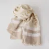 デリケートな首元にもチクチクすることがない上質リネンを使ったオリジナルのリネンストールです。上質で軽やかなリネンは、使い込むほどに柔らかく肌に馴染んでいきます。 ☑ コンセプト 「健康」「環境」「造り」をコンセプトにしたインテリアショップ自社開発のリネン製品 ☑ 天然素材100% 天然素材100%の高品質なアイテムを使いやすい価格で「リネン製品をもっと気軽に」 ☑ 低ホルムアルデヒド 定期的に国内でホルムアルデヒド検査を実施、お子さまからお年寄りまでからだにも環境にも安心 【オールシーズン使える上質リネン】 リネンって夏だけ?と思っている方はサラッとした肌触りながら、やさしい暖かさに驚かれると思います。 あたたかい素材のストールは気分じゃない・・・ 映画館や観劇で肌寒くなってしまう・・・ そんなときも、リネンストールなら重くなりすぎず、季節の変わり目にも重宝します。 もちろん、夏の室内での冷房対策や首元の日焼け防止にも。持ち歩くときは、バッグに結んでしまってもアクセントに。無造作にバッグにつっこんでもなぜかサマになります。 【デザイン】 ベースの裾に太めのラインをデザインすることで、上品な女性らしさに格好良さをプラス。リーフの刺繍は濃淡のある2色を組み合わせ、立体感を出しました。デザインと色が幾重にも組み合わさり、バランスのいい1枚になりました。 ■ブラウン ナチュラルなアイボリーをベースにブラウンのラインをデザイン。リーフの刺繍部分はライトブラウン×ホワイトの糸でランダムに縫い合わせています。 ■ブルー 爽やかなライトブルーをベースに、ブルー×グレー×ホワイトのラインをデザイン。リーフの刺繍はライトグレーとダークグレーをランダムに縫い合わせています。 ■グレー 柔らかいニュアンスグレーをベースに、ライトグレー×ホワイトのラインをデザイン。リーフの刺繍はウォームブラウンとベージュをランダムに縫い合わせています。 ■イエロー 安らげるベージュをベースに、ブラウン×ホワイトのラインをデザイン。リーフの刺繍はイエローとホワイトをランダムに縫い合わせています。