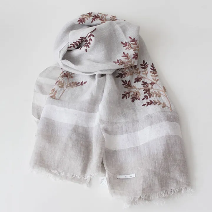 デリケートな首元にもチクチクすることがない上質リネンを使ったオリジナルのリネンストールです。上質で軽やかなリネンは、使い込むほどに柔らかく肌に馴染んでいきます。 ☑ コンセプト 「健康」「環境」「造り」をコンセプトにしたインテリアショップ自社開発のリネン製品 ☑ 天然素材100% 天然素材100%の高品質なアイテムを使いやすい価格で「リネン製品をもっと気軽に」 ☑ 低ホルムアルデヒド 定期的に国内でホルムアルデヒド検査を実施、お子さまからお年寄りまでからだにも環境にも安心 【オールシーズン使える上質リネン】 リネンって夏だけ?と思っている方はサラッとした肌触りながら、やさしい暖かさに驚かれると思います。 あたたかい素材のストールは気分じゃない・・・ 映画館や観劇で肌寒くなってしまう・・・ そんなときも、リネンストールなら重くなりすぎず、季節の変わり目にも重宝します。 もちろん、夏の室内での冷房対策や首元の日焼け防止にも。持ち歩くときは、バッグに結んでしまってもアクセントに。無造作にバッグにつっこんでもなぜかサマになります。 【デザイン】 ベースの裾に太めのラインをデザインすることで、上品な女性らしさに格好良さをプラス。リーフの刺繍は濃淡のある2色を組み合わせ、立体感を出しました。デザインと色が幾重にも組み合わさり、バランスのいい1枚になりました。 ■ブラウン ナチュラルなアイボリーをベースにブラウンのラインをデザイン。リーフの刺繍部分はライトブラウン×ホワイトの糸でランダムに縫い合わせています。 ■ブルー 爽やかなライトブルーをベースに、ブルー×グレー×ホワイトのラインをデザイン。リーフの刺繍はライトグレーとダークグレーをランダムに縫い合わせています。 ■グレー 柔らかいニュアンスグレーをベースに、ライトグレー×ホワイトのラインをデザイン。リーフの刺繍はウォームブラウンとベージュをランダムに縫い合わせています。 ■イエロー 安らげるベージュをベースに、ブラウン×ホワイトのラインをデザイン。リーフの刺繍はイエローとホワイトをランダムに縫い合わせています。