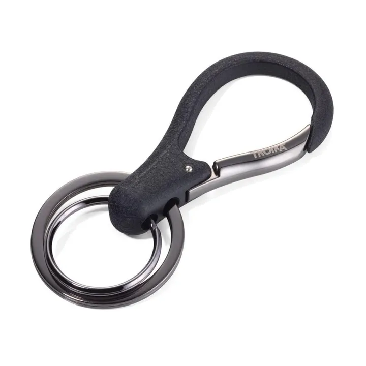 2つのリングと頑丈なフックの、丈夫で機能的なTROIKA(トロイカ)のカラビナ付きキーリング。 存在感のあるガンメタルカラーとブラックのコンビネーションのキーリングです。 複数の鍵を持ち歩く際に特におすすめです。