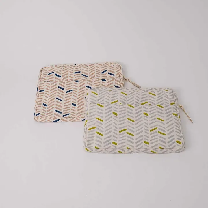 リモートワークでノートPCやタブレットなどを持ち歩くのに便利なラップトップポーチ。 沢山のポケットが機能性を高め、スマホやペン、 ノートなどを収納したままバッグに入れれば通勤・通学もスムーズに。 *外ポケット×7 **BLOCKPRINT** ブロックプリントとは 木彫りの版でハンコを押すように1柄ずつ1色ずつプリントされたものです。 まずはアウトラインとなる柄のスタンプを押していき、その後色をのせていきます。 使われている色の数だけ、作業は複雑になっていきます。 全て手作業の為、染めムラやスタンプの境目などが少し出ていますが それがブロックプリントの良さでもあり、風合いとなっております。 機械化が進むこの時代にこの風合いをぜひお楽しみ下さい。 【ポーチ】【モバイルポーチ】【ブロックプリント】