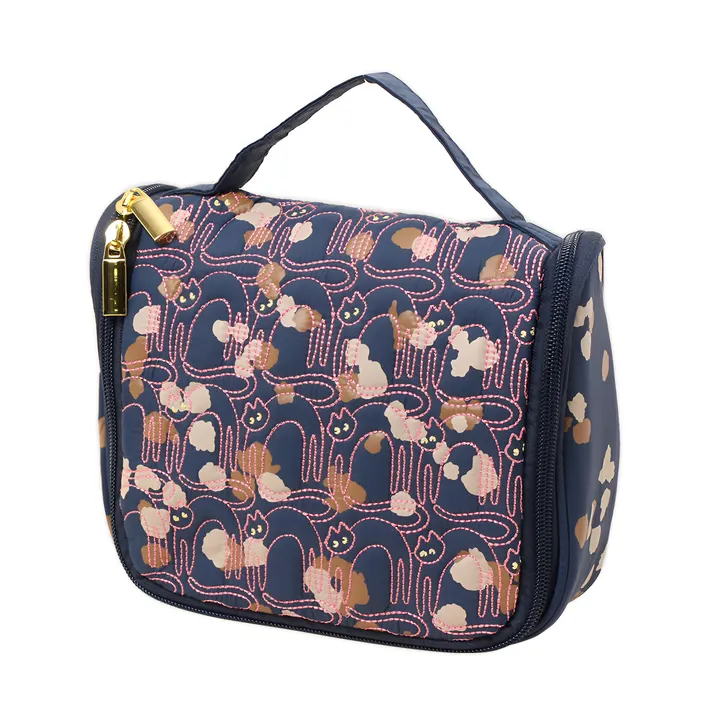 愛嬌のある猫を刺繍したシリーズ。 鮮やかな生地色と斑柄プリントとのバランスが絶妙です。 愛らしいピンク・爽やかなグリーン・上品なネイビーの3色展開で、あなたのトランクケースの中を彩ります! マチのあるタイプの吊りポケットは旅を快適にするスグレモノ! ボトルやブラシなど厚みのあるものがスッキリ収まって、旅先ではそのままフックで掛けて使えます。 ハンドル付きで持ち運びも楽々♪
