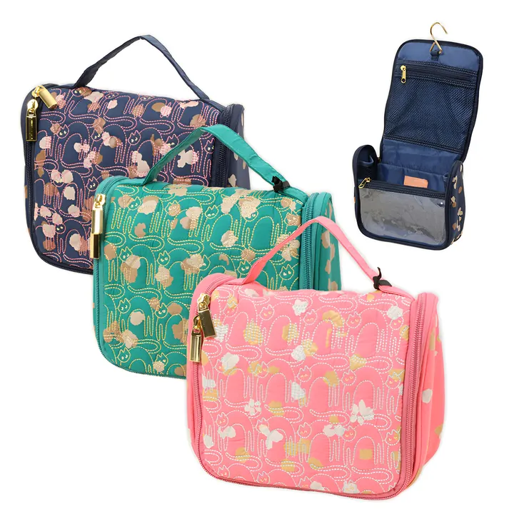愛嬌のある猫を刺繍したシリーズ。 鮮やかな生地色と斑柄プリントとのバランスが絶妙です。 愛らしいピンク・爽やかなグリーン・上品なネイビーの3色展開で、あなたのトランクケースの中を彩ります! マチのあるタイプの吊りポケットは旅を快適にするスグレモノ! ボトルやブラシなど厚みのあるものがスッキリ収まって、旅先ではそのままフックで掛けて使えます。 ハンドル付きで持ち運びも楽々♪