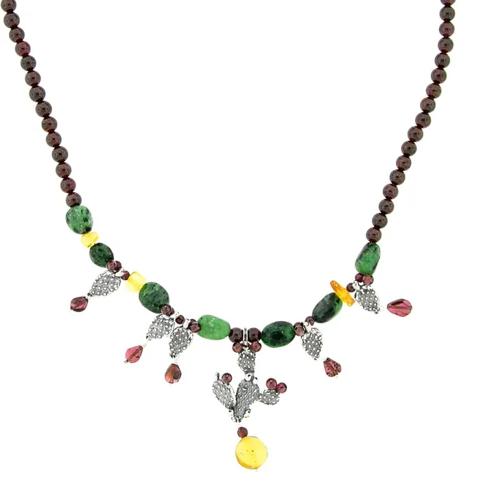 シルバーのウチワサボテンの実にガーネットをあしらい ガーネット、アゲート、アンバーで贅沢にし仕上げました メキシコらしさを強調した魅力的でまぶしいネックレスです