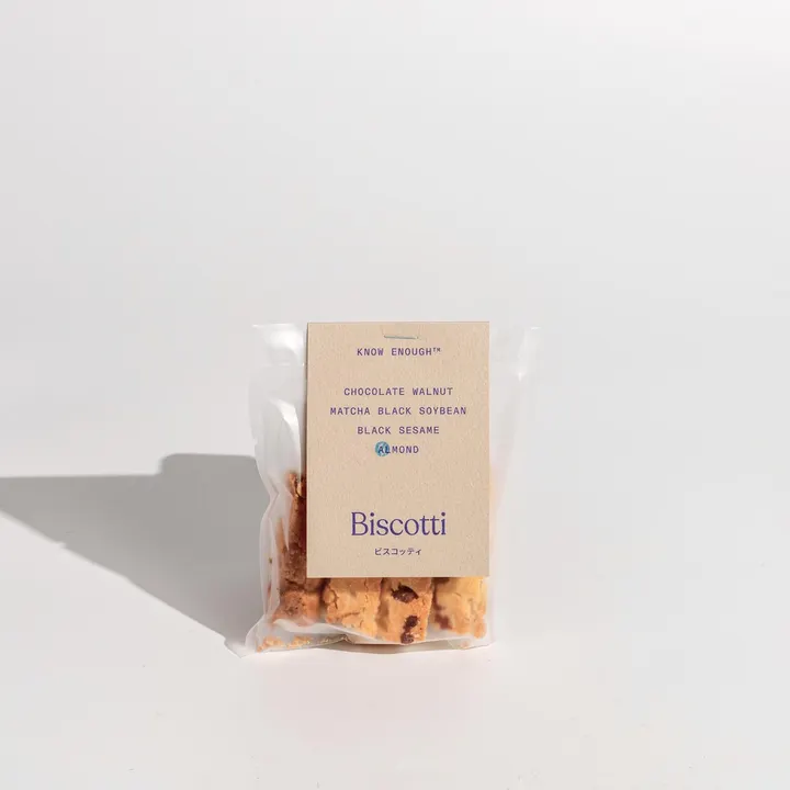know enoughから新商品! 食べ応えのあるビスコッティ。様々なシチュエーションにてお召し上がりいただけます。 ※こちらの商品につきましては納品11月〜になります。 【特 長】 北海道産の素材にこだわり、卵・乳製品・小麦を使わず仕上げたヴィーガン&グルテンフリーのビスコッティ。 噛むほどに広がる香ばしさと、上品な余韻が特徴です。 コーヒーや紅茶はもちろん、ワインやウイスキーなどのお酒にも寄り添う味わい。 カフェタイムから大人のリラックスタイムまで幅広く楽しんでいただけます。 贈り物やホテルのギフト、セレクトショップの棚に並べていただける、「上質を纏う大人のビスコッティ」です。 Vegan, Gluten-Free 【フレーバー】 ⚫︎チョコくるみ 赤ワインやブランデーに寄り添うビターな味わい。 北海道美唄産のくるみが香ばしくカカオと合わさり深みがまします。 くるみの余韻が大人の時間に寄り添います。 ⚫︎抹茶黒豆 日本酒や緑茶ハイとも好相性。和のペアリングに。 北海道産黒豆と抹茶を合わせた和の味わい。 上質なほろ苦さと、黒豆のやさしい甘さが調和します。 ⚫︎黒ごま黒豆 香ばしさが焼酎やウイスキーの余韻と響き合う。 香ばしい黒ごまと黒豆の組み合わせ。 噛むほどに広がるコクと香りが、滋味深い一枚です。 ⚫︎アーモンド 白ワインやシャンパンとも調和する王道のフレーバー。 香ばしくローストしたアーモンドの王道フレーバー。 シンプルながら飽きのこない、素材の力を感じる味わいです。 【シーン】 ⚫︎日常シーン 朝のひと口: コーヒーや豆乳ラテと合わせて、軽やかなエネルギーチャージ。 午後の休息: 紅茶と共に、本を片手にゆっくり楽しむ。 ギフトに: 健康志向や食の多様性を大切にする方への贈り物に最適。 ⚫︎ お酒と共に チョコくるみ × 赤ワイン/ブランデー  ビターなカカオとナッツの香ばしさが、濃厚な果実味にマッチ。 抹茶黒豆 × 日本酒/抹茶ハイ  上品な抹茶のほろ苦さと黒豆の甘さが、和のテイストを引き立てる。 黒ごま黒豆 × ウイスキー/焼酎  香ばしいごまのコクが、樽香や麦の香りと重なり奥深い余韻。 アーモンド × 白ワイン/シャンパン  シンプルで洗練された香ばしさが、華やかな泡や酸味と調和。 【賞味期限】 製造から4ヶ月