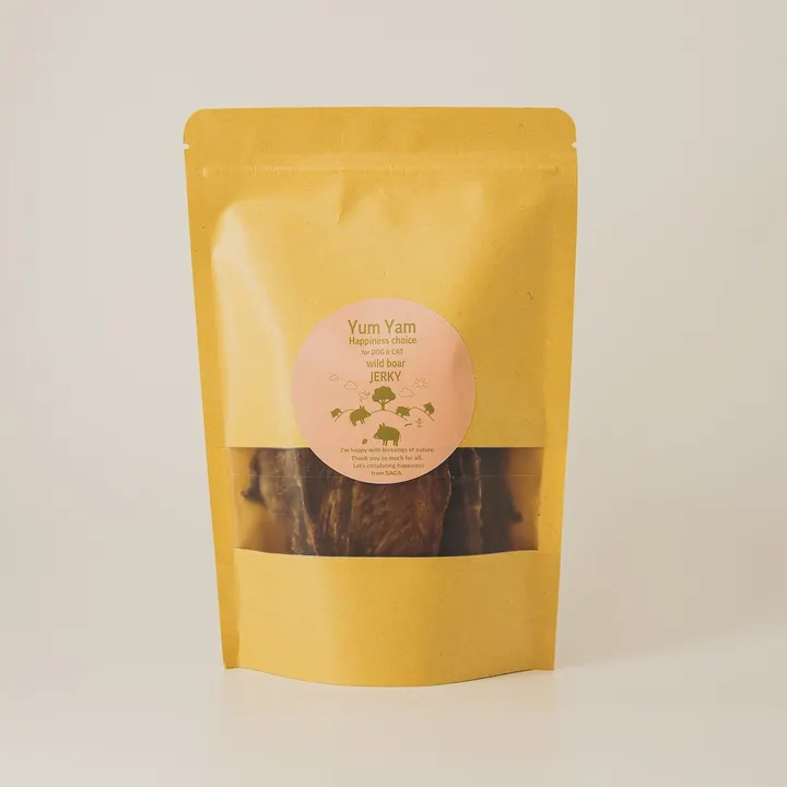 YUM(美味しくて)  YAM(ヤミツキになっちゃう)   JERKY(ジャーキー) YUMYAM JERKYの中では一番ミニマムサイズ。 イノシシのジャーキーを食べてくれるか分からない、これを機にイノシシデビューしてみようかなという方にお試ししていただくにちょうどよいサイズ感です。また、トレーニングや外出時のおやつにも持ち運びしやすい大きさです。 さくらチップで燻した香りでワンさん・ニャンさんを虜にします。 最初から最後まで手作業でていねいに作り上げたジャーキー、ヤミツキになる事間違いなし!! 原材料:イノシシ肉 内容量:110g 成分:(498kcal / 100g) タンパク質78% 水分10.9% 脂肪5.7% 灰分5.2% ※100%天然素材 ※ヒューマングレード ※完全無添加 ※完全無投薬