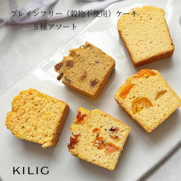 【小麦・米粉・白砂糖・乳製品不使用の低糖質ケーキブレッド】 小麦粉などの穀物類を使用せず、アーモンドパウダ、ココナッツフラワー、卵、ココナッツオイル、などを基本の生地にし焼き上げました。 ナッツの栄養がぎっしり詰まった生地は、見た目のサイズ感より食べ応えがあり、腹持ちも良いので食欲がない朝の食事代わりにも。 アーモンドやココナッツなど低糖質で栄養価の高い素材をベースに、旬の野菜やフルーツなどを焼き込んだギルトフリーなケーキです。 こちらは人気の定番商品と季節限定商品より毎月5種類を1カットずつ詰め合わせたお得なアソートセットです。初めてのグレインフリーケーキのお試し用にご利用ください グレインフリー(穀物不使用)ケーキはフレーバーごとにお味も食感もそれぞれ異なります。また、ケーキのベース生地にココナッツシュガーを使用した甘みのあるタイプとシュガーフリーのタイプを一度にお試しいただけますのでぜひ食べ比べをお楽しみください。 【内容】 ・無花果&胡桃(甘みあり): 大粒で柔らかく濃厚な甘味と酸味が美味しいトルコ産のドライ白イチジクとローストした胡桃をたっぷり混ぜ込みました。 ・アップルバター:(甘みあり) 信州安曇野産のグラニースミス(青りんご)を使用したアップルバターを混ぜ込んだ ふんわり優しい風味のアップルケーキ。 アップルバターは甘さ控えめ、バター不使用のヘルシースプレッドです。 ・金柑:(甘みなし) 小さくても栄養たっぷりな金柑をふんだんに混ぜ込んだ旬のケーキです。 爽やかな香りと甘さ、ほろ苦さをぜひお試し下さい ・パイン&ココナッツ(甘みなし) ジューシーなパインシロップが染み込んでしっとり甘酸っぱい美味しさ ・ヴィーガンチーズ(シュガーフリー仕様) 高タンパク、脂質も糖質もゼロ!ニュートリショナルイーストとカシューナッツで作るヴィーガンチーズのケーキ 【グレインフリーとは?】 グレインフリーとは小麦・米粉・大豆などの穀物類(グレイン)を控える あたらしい「食」の「ライフスタイルです。 穀物類の多くは糖質も多く近年の健康志向の高まりから 海外のオーガニック系スーパーなどでも グルテンフリーの選択肢の一つとして注目されています。