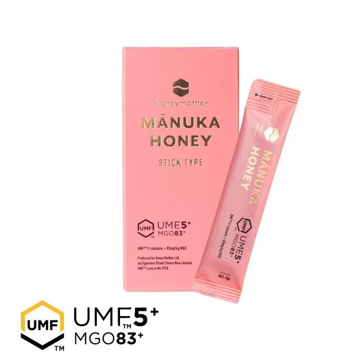 【スティック マヌカハニー】 ・活性レベル:UMF5+ / MGO83+ ・内容量:1箱(10g×8本) ・賞味期限:期限まで2年の商品を発送いたします ・原材料:非加熱はちみつ ・原産国:ニュージーランド ・保存方法:直射日光を避け冷暗所に保管して下さい ■注意 ・一歳未満のお子様・はちみつアレルギーの方はお召し上がり頂けません ・妊娠・授乳期は問題なくお召し上がり頂けます ・マヌカハニーは採取時期・地域によって色味が異なる場合がございますが、品質面での影響はございません。