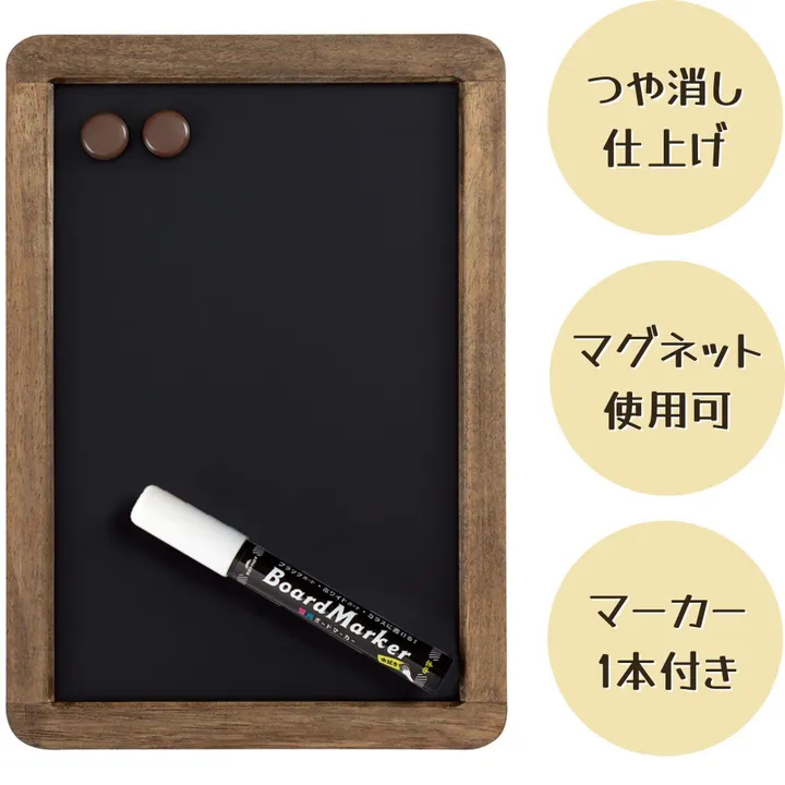 【メニューボードに最適】 マーカーでもチョークでも書き消し可能。 木の素材を生かしたアンティーク仕上げでお店の雰囲気をあたたかく演出します。 板面はつや消し仕上げで日光や蛍光灯の明かりが当たっても反射せず、書いてある内容が見やすい仕様です。 マグネットも使用可能で、メニューの写真などを貼り付けられます。