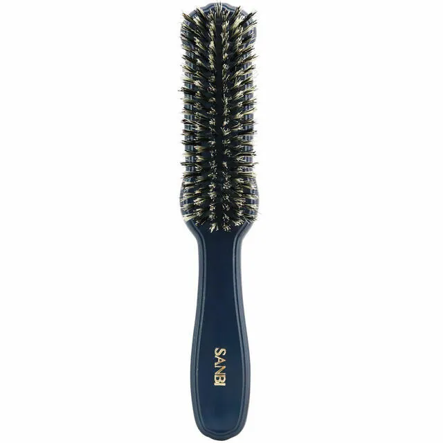 髪にツヤを出すには動物毛のブラシがおすすめです。しかし従来の豚毛のブラシは、細く柔らかい髪質の人には頭皮の刺激が強すぎるため、「細く柔らかい毛を密に植えたヘアブラシ」が適しています。SANBIでは、柔らかい白豚毛と黒豚毛を独自の方法で調合し、ソフトなあたりのブラシを独自のノウハウで開発。ハンドルを樹脂にして軽さとお手入れのしやすさを両立しました。