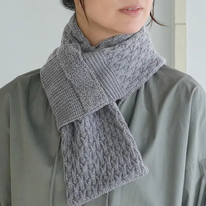 編み模様が魅せる、コンパクトなぬくもり 三角地模様とループ編みを組み合わせた、表情豊かなミニマフラー。4種の地模様がさりげないアクセントとなり、シンプルながらも個性を引き立てます。男女兼用で使えるデザインはギフトにも最適。コンパクトに収納できる手軽さも魅力で、寒い季節に気軽に持ち歩ける、スタイリッシュな防寒アイテムです。 【素材について】 ウールは暖かく吸水性、吸湿性に優れた天然素材です。一方のアクリルはウールに似せて作られた合成繊維で、ふっくらとやわらかく保温性、耐久性が高く、乾きやすさが特徴です。ウールには縮み、アクリルには吸水性、吸湿性が低いなど、それぞれにデメリットもありますが、合わせることによって弱点を補った素材になっています。