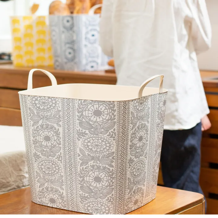 Finlaysonとのコラボレーションシリーズ 出し入れラクラクのポンポン収納。投げ入れるだけなので、小さなお子さんでも、ズボラさんでも お部屋やキッチンなどキレイにすっきり片づけれます! また別売りのフタ、「onbaquet by mooq」を載せれば、収納物の目隠しはもちろん、ちょっとしたサイドテーブルにもなります。 木目調でどのインテリアにも馴染みやすく、 お子さんがお絵描きする時の台にしたり、おやつや飲み物を置いたり、ソファー横や、アウトドアなどでも活躍します! ◆stacksto, In-Patterns スタックストー,インパターンズ 無数にある柄や模様の中から、お気に入りに出会えた時のあの高揚感を収納でつくれないだろうか。素材の柔らかさが特徴のstacksto, baquetの In-Patternsプロジェクト(柄入りバケット)はそこから始まり、バケットの製造国であるフランスはもとより、特殊な印刷や樹脂フィルム製造を手掛ける、世界でも希少な製造元らとの協業によって生まれました。 印刷を「載せる」のではなく、図版の持つ質感まで四角い形となって表現される。 かもし出す雰囲気がインテリアの中で個性を発揮する、今までにない収納をつくりました。 ◆Finlayson 1820年に創業された、北欧フィンランド最古のテキスタイルブランド。1820年、タンペレ(フィンランド)に設立した紡績工場の敷地内には、学校や図書館、教会などの各施設が作られ、フィンランド最大の工業都市として発展を遂げる。1951年にはフィンランドで最も早く自社内にデザインアトリエを設立。1950年代(CORONNA)、1960年代(TAIMI, ELEFANTTI)に生まれた、何十年もの間親しまれている人気のクラシック柄と、そのシーズンのトレンドカラーやモチーフをとらえた魅力的な新柄による豊富なバリエーションは、国内外で広く親しまれている。