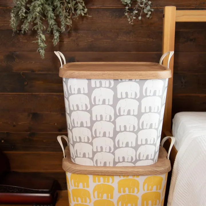 Finlaysonとのコラボレーションシリーズ 出し入れラクラクのポンポン収納。投げ入れるだけなので、小さなお子さんでも、ズボラさんでも お部屋やキッチンなどキレイにすっきり片づけれます! また別売りのフタ、「onbaquet by mooq」を載せれば、収納物の目隠しはもちろん、ちょっとしたサイドテーブルにもなります。 木目調でどのインテリアにも馴染みやすく、 お子さんがお絵描きする時の台にしたり、おやつや飲み物を置いたり、ソファー横や、アウトドアなどでも活躍します! ◆stacksto, In-Patterns スタックストー,インパターンズ 無数にある柄や模様の中から、お気に入りに出会えた時のあの高揚感を収納でつくれないだろうか。素材の柔らかさが特徴のstacksto, baquetの In-Patternsプロジェクト(柄入りバケット)はそこから始まり、バケットの製造国であるフランスはもとより、特殊な印刷や樹脂フィルム製造を手掛ける、世界でも希少な製造元らとの協業によって生まれました。 印刷を「載せる」のではなく、図版の持つ質感まで四角い形となって表現される。 かもし出す雰囲気がインテリアの中で個性を発揮する、今までにない収納をつくりました。 ◆Finlayson 1820年に創業された、北欧フィンランド最古のテキスタイルブランド。1820年、タンペレ(フィンランド)に設立した紡績工場の敷地内には、学校や図書館、教会などの各施設が作られ、フィンランド最大の工業都市として発展を遂げる。1951年にはフィンランドで最も早く自社内にデザインアトリエを設立。1950年代(CORONNA)、1960年代(TAIMI, ELEFANTTI)に生まれた、何十年もの間親しまれている人気のクラシック柄と、そのシーズンのトレンドカラーやモチーフをとらえた魅力的な新柄による豊富なバリエーションは、国内外で広く親しまれている。