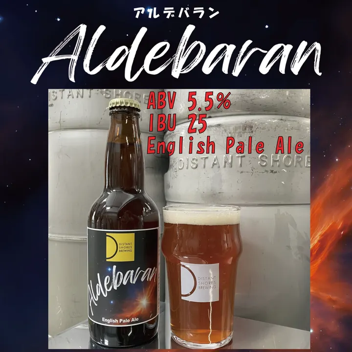 EnglishPaleAle 夜空に輝く茜色の星『アルデバラン』 飲む人の夜を明るく彩る濃い褐色が名前の由来です。 モルトの配合にこだわり、その香りと口にふくんだ際のビター感を大切にしました。 UK産ホップの香りがモルト感にそっとひかえめに寄り添います。ほのかにスモークチップやスパイスを感じる味わいが楽しいEnglishPaleAleです。 Cheers!! アルコール分:5.5% IBU 25