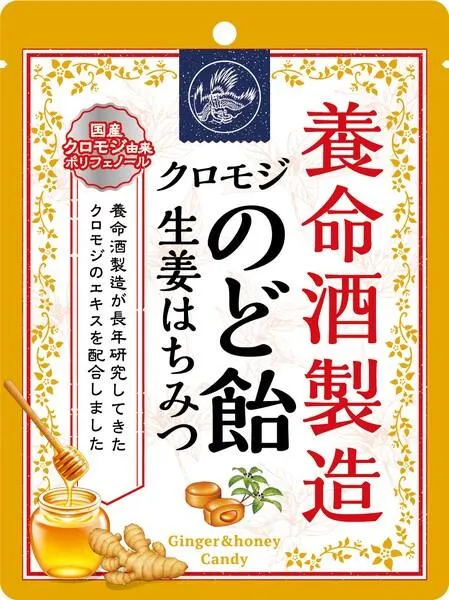養命酒製造が長年研究してきたクロモジのエキスを配合したのど飴。 冬に定番の生姜と自然な甘さのはちみつを使用し、素材本来の味わいにこだわりました。 とろ〜りとした生姜風味のはちみつ入りペーストを、ハードキャンディーで包み込んだ2層構造で、味わいの変化をじっくりとお楽しみいただけます。 ※注意※ はちみつを使用しておりますので、1歳未満の乳児には与えないでください。