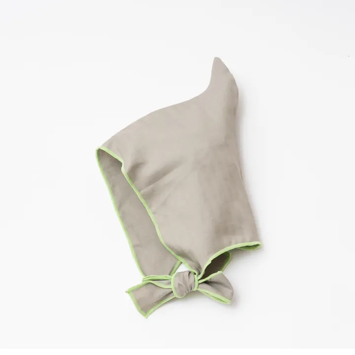 ASAMIDORI(アサミドリ) 春の訪れを感じさせる新緑の色「浅緑」に、静かな薄曇りのグレーを重ねる配色。自然の移ろいと生命の芽吹きを象徴。「浅緑」は古来、日本で“若葉の希望”を表す色として平安時代から用いられてきた色です。 テーマ Quiet growth ― 静けさの中の芽吹き 都市と自然のあわいを生きる現代の親子に寄り添う、透明感のあるイメージでお作りしています。 日本の伝統技法「和晒(わざらし)」で丁寧に仕上げた国産ガーゼを使用。水と蒸気の力でゆっくりと不純物を取り除き、綿本来のやわらかさを引き出しています。赤ちゃんの肌にも安心です。 縁はふんわりとしたウーリー糸で仕上げ、柔らかさの中に凛とした表情を添えています。 とんがり帽子は、赤ちゃんの頭をやさしく包み込みながらも、すっきりとしたシルエットを描くデザイン。 縫い目を最小限に抑え、軽やかなかぶり心地を実現しました。 リボンは上品さを意識し、カジュアルになりすぎないよう仕上げています。 先端のとんがりは、すこやかな成長を願う「伸びゆく」かたちをモチーフにしています。 軽くて通気性がよく、季節を問わず快適にお使いいただけます。