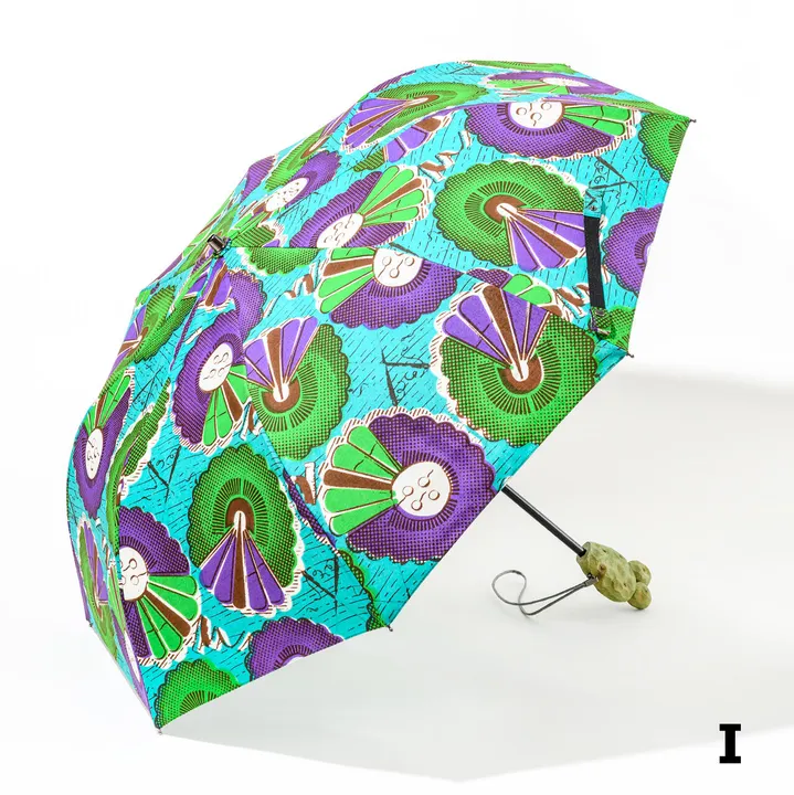 西アフリカのアフリカンプリント生地に国内で撥水、UV加工を施した晴雨兼用折りたたみパラソルです ハンドルは国内の木彫家が楠木を彫刻し着彩しています プリント生地はローカルマーケットから仕入れたものなので同じ柄は沢山は作れません(柄違いはあります) 紐のループがついていて手にかけられます チャームポイントはバッグから覗くサボテンで、コミュニケーションツールともなります 1年中明るく楽しい気分でファッションを盛り上げます