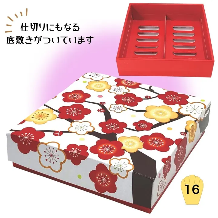 新年のご挨拶やご長寿のお祝いなど 様々な祝い事に使える華やかな贈答箱。 アレンジできる仕切り付でいろんなお菓子の組み合わせに対応でき、 とても便利です。 年間通して使える、ご挨拶ギフトにぴったりの紙製ギフトボックス。 ツヤのある素材で高級感もあり、様々なお祝いごとに最適な贈答箱です。 かぶせ箱で華やかな贈り物に使えるデザインが好評です。 便利な仕切り付きで、仕切りを倒せば、竿物の御菓子にも対応できるため いろんなお菓子の組合せに対応できます。 シールや包装紙、リボンなどのラッピングも特に必要ありません。 マドレーヌだと約16個程度の入るサイズです。