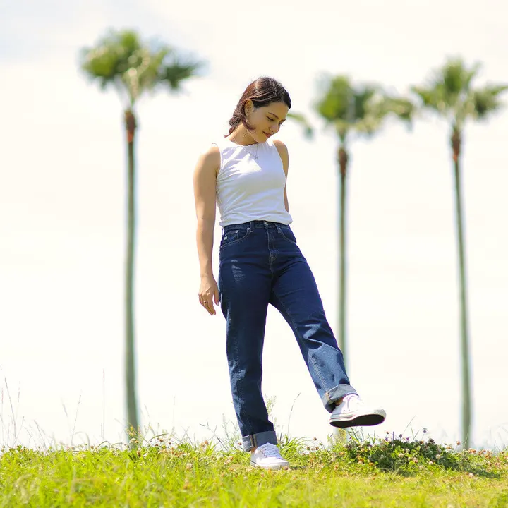 廃棄されたジーンズなどのリサイクル素材およそ40%とオーガニックコットンからできた糸から新しいデニムを生産。ボタンやリベットは100%ステンレス製を使用。