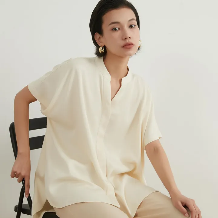 比翼仕立てのデザインでミニマルな印象の半袖ブラウス。高品質のレーヨンを使用し、程よいつやと肉厚のある素材でドレープ感のある大人の印象を演出。 体系をひろわないゆとりのあるHラインに、引き締め効果のV字開きの襟元でシルエットにメリハリをつけました。 サイズ  着丈  バスト  裄丈 FREE   77   140    41 素材:レーヨン100%  透け感:なし 光沢感:ややあり 裏地:なし 家庭洗濯:可能(ネット使用) 【注意点】 ※撮影商品はサンプルの為、実際の仕様と異なる場合がございます。 ※画像の商品は光の照射や角度、お使いのモニター環境により、実物と色味が異なる場合がございます。スタジオ物撮りの画像が実物の色味に一番近くなっております。 ※予約商品の場合、お届け予定はあくまでも目安となります。 生産の都合上、お届け時期がずれる場合がございますので、あらかじめご了承ください。 ※表記サイズは商品の実寸です。 ※布製品の特性上、サイズ表の実寸法は多少の誤差が生じる場合がございますので、予めご了承ください。 #高品質レーヨン#ドレープ感#シンプルトップ#サステナブル #ルーズフィット#おしり隠れる#プラケット#半袖#きれいめファッション#エフォートレス