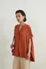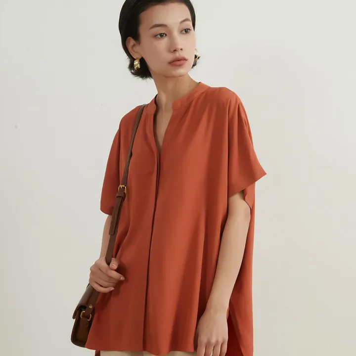 比翼仕立てのデザインでミニマルな印象の半袖ブラウス。高品質のレーヨンを使用し、程よいつやと肉厚のある素材でドレープ感のある大人の印象を演出。 体系をひろわないゆとりのあるHラインに、引き締め効果のV字開きの襟元でシルエットにメリハリをつけました。 サイズ  着丈  バスト  裄丈 FREE   77   140    41 素材:レーヨン100%  透け感:なし 光沢感:ややあり 裏地:なし 家庭洗濯:可能(ネット使用) 【注意点】 ※撮影商品はサンプルの為、実際の仕様と異なる場合がございます。 ※画像の商品は光の照射や角度、お使いのモニター環境により、実物と色味が異なる場合がございます。スタジオ物撮りの画像が実物の色味に一番近くなっております。 ※予約商品の場合、お届け予定はあくまでも目安となります。 生産の都合上、お届け時期がずれる場合がございますので、あらかじめご了承ください。 ※表記サイズは商品の実寸です。 ※布製品の特性上、サイズ表の実寸法は多少の誤差が生じる場合がございますので、予めご了承ください。 #高品質レーヨン#ドレープ感#シンプルトップ#サステナブル #ルーズフィット#おしり隠れる#プラケット#半袖#きれいめファッション#エフォートレス