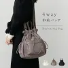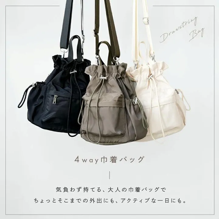 忙しいママや働く女性にぴったりの 4way巾着バッグ。 軽量設計で肩への負担が少なく、通勤や通学、旅行、デートなどさまざまなシーンで活躍します。 ころんとした可愛いデザインと上品な3色展開で、カジュアルにもきれいめにも合わせやすいのが魅力。 ハンドバッグ、ショルダーバッグ、リュック、バックパックの 4wayで持ち方自由自在。 両手があくので子連れのおでかけや公園、授業参観、ドライブなどでも大活躍します。 ハンドバッグ、ショルダーバッグ、リュック、バックパックの 4wayで持ち方自由自在。 両手があくので子連れのおでかけや公園、授業参観、ドライブなどでも大活躍します。 小さめサイズながら 500mlペットボトルや長財布もすっきり収納可能。 必要な必需品だけをスマートに持ち運べます。 軽量かつ使いやすい設計で、マザーズバッグとしても人気です。 通勤や旅行のサブバッグとしてもおすすめで、2025秋冬の新作トレンドバッグとしても注目。 「軽量」「かわいい」「上品」「荷物整理しやすい」「肩の負担が少ない」「収納力抜群」など、 ママや女性の悩みを解決するポイントを詰め込んだ 4wayバッグ。 あなたの日常に、使いやすさとおしゃれを両立したバッグを取り入れてみませんか? 【ご使用時の注意事項】 マグネットボタンの特性上、強い衝撃や一方方向へ加重が掛かった際にボタンが外れる場合がございます。 重さのある荷物を入れてリュックとして使用する場合などは、巾着部分をお締めいただきご使用ください。