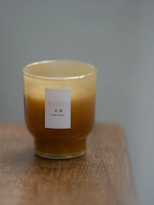 kotoの自社アトリエで作る四季巡る二十四節気のキャンドルは、厳選した原材料を配合し、ブレンドや調合、箱詰めまで一点一点職人の手によって心を込めてしつらえています。 大豆とアブラヤシの天然ワックスを独自にブレンドし、香りの拡散と持続、燃焼効率に優れたハンドメイドキャンドルをお届けします。 夏の暑さがやわらぎはじめる頃――処暑。 夜にはマツムシや鈴虫の声が響き、涼やかな音色が秋の入り口を告げます。稲穂が黄金色に色づきはじめる一方で、台風が訪れる季節でもあります。「処暑の香り」は、塩気を帯びた海風にほんの少しの神秘を溶かし込んだようなフレグランス。 ミネラル豊かな海塩の複雑さをそのまま閉じ込め、スパを思わせる落ち着きと、包み込むような海の安らぎを漂わせます。最初に広がる トップノートは、カルダモンとオレンジピール。 爽やかさのなかにスパイスの温もりが重なり、軽やかで洗練された幕開けを描きます。続く ミドルノートでは、リッチでミネラル感のあるシーソルトが香りの中心を満たし、潮風を思わせる深みと透明感を放ちます。 そして ベースノートでは、パーム(椰子)、ライトムスク、アンバーがやさしく重なり、波音のように静かで心地よい余韻を残します。 カルダモン、クローブ、オレンジの天然精油が香りに奥行きを加え、落ち着きのなかに明るさと温かみを添えています。 トップにはオオケタデをあしらい、穏やかな季節の彩りを映しました。潮風のようなやさしい安らぎが暮らしに漂い、心に穏やかな余韻を残しながら、夏から秋への移ろいをなめらかに感じさせてくれる香りです。 二十四節気の移ろいに寄り添うように、kotoのキャンドルはすべて厳選された原材料を用い、自社工場で一点一点、手作業で仕立てています。ワックスの配合や芯の細部に至るまで丁寧にこだわり、美しく灯りと香りを楽しんでいただけるよう心を込めています。朝の始まりから夜のひとときまで、季節の気配を感じる香りが日常に溶け込み、暮らしのリズムにそっと寄り添ってくれます。 また、キャンドルを包むグラスは、使い終えた後に湯煎して洗うことで、繰り返しお使いいただけます。kotoがご用意する別売りのティーライトキャンドルを中に入れて灯せば、二十四節気の香りをより気軽に楽しみ続けていただけます。香りと灯火を長く愛でながら、持続可能なかたちで季節の移ろいを感じていただけるように、私たちはものづくりに心を尽くしています。 【使用上の注意】 灯している時はキャンドルのそばから離れないようにしてください。一度に2時間以上の燃焼はおやめください。長時間燃焼すると、グラスが大変暑くなり破損する恐れがあります。芯が長くなったり曲がったりすると火が大きくなったり、黒い煙が出やすくなります。灯す前に芯を7mm程度にカットし、整えてください。お子様やペットの届くところでの燃焼はおやめください。サイズ選択数量 カートに追加する ご使用方法 ----- 1. 灯している時はキャンドルのそばから離れないようにしてください。 2. 一度に2時間以上の燃焼はおやめください。長時間燃焼すると、グラスが大変暑くなり破損する恐れがあります。 3. 芯が長くなったり曲がったりすると火が大きくなったり、黒い煙が出やすくなります。灯す前に芯を7mm程度にカットし、整えてください。 4. お子様やペットの届くところでの燃焼はおやめください。