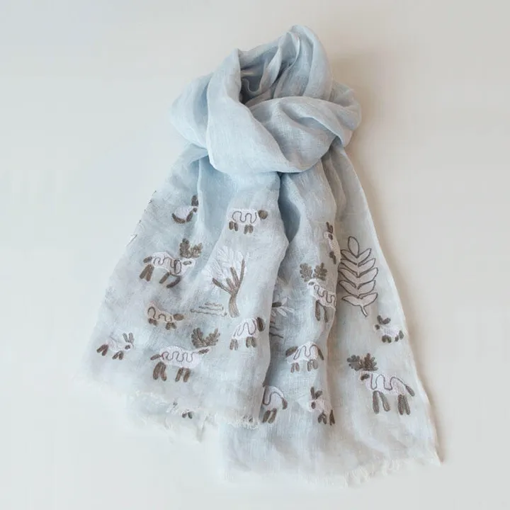 デリケートな首元にもチクチクすることがない上質リネンを使ったオリジナルのリネンストールです。上質で軽やかなリネンは、使い込むほどに柔らかく肌に馴染んでいきます。 ☑ コンセプト 「健康」「環境」「造り」をコンセプトにしたインテリアショップ自社開発のリネン製品 ☑ 天然素材100% 天然素材100%の高品質なアイテムを使いやすい価格で「リネン製品をもっと気軽に」 ☑ 低ホルムアルデヒド 定期的に国内でホルムアルデヒド検査を実施、お子さまからお年寄りまでからだにも環境にも安心 【オールシーズン使える上質リネン】 リネンって夏だけ?と思っている方はサラッとした肌触りながら、やさしい暖かさに驚かれると思います。 あたたかい素材のストールは気分じゃない・・・ 映画館や観劇で肌寒くなってしまう・・・ そんなときも、リネンストールなら重くなりすぎず、季節の変わり目にも重宝します。 もちろん、夏の室内での冷房対策や首元の日焼け防止にも。持ち歩くときは、バッグに結んでしまってもアクセントに。無造作にバッグにつっこんでもなぜかサマになります。 【デザイン】 遊び心のあるほっこりしたアニマル(親ひつじ、子ひつじ、しか、うさぎ)刺繍は、小さなお子さまがお絵かきしたような愛らしさが魅力。この1枚には、子どもを見守る親の愛情、友達を気に掛ける友情など、たくさんの思いやりが詰まっています。 ■ブルー ベースのライトブルーは、心地良い日の空の色をイメージしました。アニマルの刺繍はホワイト×ライトグレーを縫い合わせています。 ■グレーベージュ ベースのグレージュは、ゆったりした日の空気の色をイメージしました。アニマルの刺繍はベビーピンク×ベビーイエローを縫い合わせています。