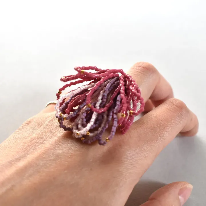 大きな釣鐘状の花を垂れ下げて咲く ホタルブクロ その花姿はまるで 空気をはらんだロングドレスを 着飾っているようです material ガラスビーズ、金糸、フェルト、ゴム *ゴールドビーズは本金メッキ加工を施したものを使用しております size モチーフ約28x40mm、指まわりフリー(約9号〜) *伸縮性のあるゴムを使用しているためフリーサイズでお着用いただけます weight 約7.94g *CACICOの商品は全て1点1点制作しているため、個体差があり、商品写真と差がある場合がございます。ご了承の上、ご購入ください。 *金属アレルギーの方はご使用をお控えください *受注生産のため、ご注文確定後1週間〜10日以内に商品を発送いたします