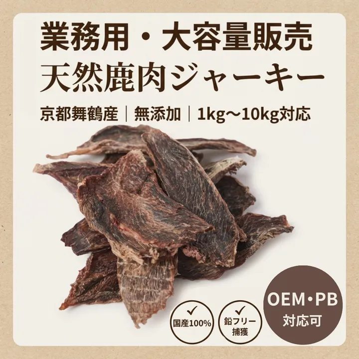 国産・天然鹿肉100%の無添加鹿肉ジャーキーです。 京都舞鶴産の天然鹿のみを使用し、猟銃を使わない箱罠捕獲にこだわることで、鉛フリー・低ストレス・高品質な鹿肉を原料としています。 弊社の鹿肉ジャーキーは、 低脂肪・高タンパクで食いつきがよく、「食べない犬でもよく食べる」ことが特長です。 香料・保存料・着色料を一切使用せず、職人が一枚一枚丁寧に温風乾燥することで、鹿肉本来の旨味と栄養を最大限に引き出しています。 手で割れるやわらかさのため、小型犬やシニア犬、アレルギーが気になるワンちゃんにも適しています。 現在は一般向け製品に加え、業務用バルク(中身)販売およびOEM対応も行っています。 鹿肉を安定的に確保しており、1kg・3kgなどの業務用単位での供給が可能です。 ・バルク原料として仕入れ、自社ブランドで小分け販売 ・店舗・ペットショップ向けのPB商品展開 ・オリジナルパッケージでのOEM商品化 など、中身(原料)のみの供給から、最終商品としてのパッケージングまで柔軟に対応します。 素材の安全性・品質・ストーリー性を重視し、 「本当に犬の健康を考えたおやつ」を届けたい事業者様に向けた鹿肉ジャーキーです。