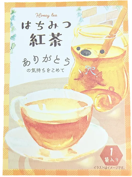 パッケージと外箱をリニューアルいたしました。 可愛いクマのはちみつ容器が描かれた袋の「はちみつ紅茶」 華やかな香りとはちみつのまろやかな甘さが調和した、「はちみつ紅茶」。 お湯や水に溶かしてサッとお作り頂けるので、自宅でのリラックスタイムや外出先でもお好きなタイミングでお飲み頂けます。 1袋ごとにありがとうのメッセージ付きの袋に入っているため、プレゼント等におすすめです。