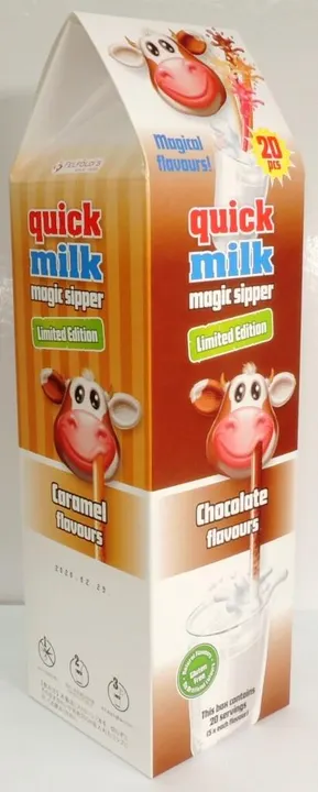 普通のミルクがストロー1本で簡単にフレーバーミルクに早変わり! 冷たい牛乳にストローを入れて飲むとキャラメル味になります。 牛乳を楽しく飲んでいただけます。 ミルクをこのストローで飲むだけであっという間にフレーバーが変わる瞬間は ちょっと感動ものです! チョコレート5本、バナナ5本、ストロベリー5本、キャラメル5本 合計20本入り 100%ナチュラル! 人工香料、人工色素などは一切使用していない安心素材! ディスプレイBOX付なので、そのままお店に並べていただけます! (飲み方) 冷たい牛乳約200mlを入れたコップに本製品1本を入れてお飲みください。 【Felfoldi】(フェルフォルディ) フェルフォルディ社は、ハンガリーのキャンディメーカーです。 1986年の設立以来、斬新な製品開発と高い品質管理を徹底し、 今ではヨーロッパをはじめ世界25カ国以上に輸出されるまでになりました。 製品はハンガリー国内においてマーケットシェアNo.1を誇ります。 またフェルフォルディ社のキャンディ製品は思わず手にとってみたくなるような、 魅力あふれるデザインも自慢の1つです。