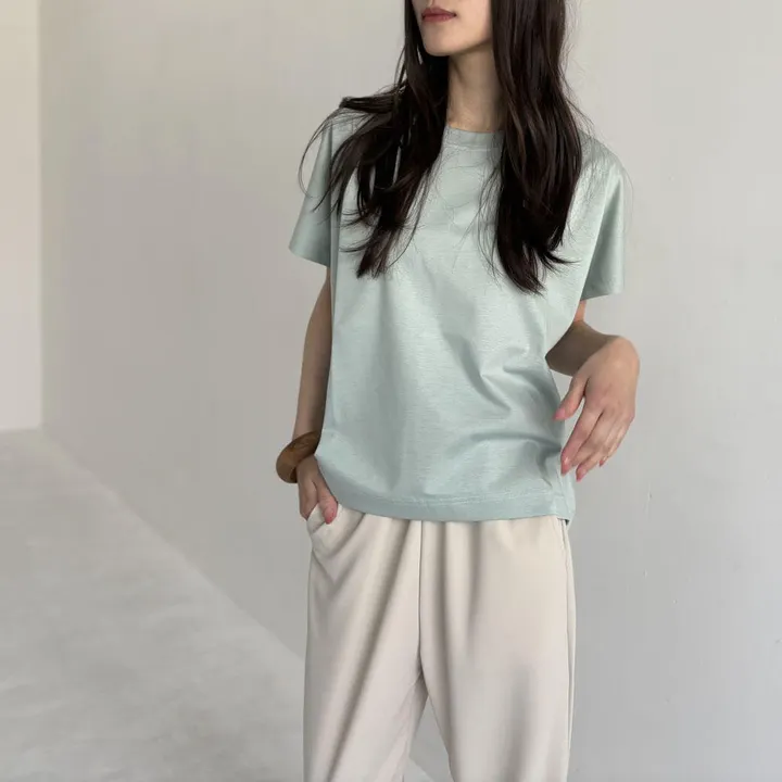 コットンポンチ_フレンチスリーブ_カットソーブラウス クルーネック、フレンチスリーブの シンプルでカジュアルなプルオーバーです。 光沢のあるきれい目の素材を使っているので ジャケットのインナーに最適で デニムやカーゴパンツとコーディネイトしても 上品なイメージになるアイテムです。 着丈56cm 身幅53cm 裄丈36cm ********************************* youtubu動画:https://youtu.be/df-w4K-ghqg instaglam:https://www.instagram.com/sirenemermaid_i/ ********************************* Cotton 100% スーピマコットンポンチロイヤルクール 柔らかくしなやかな風合いをもつスーピマコットン コットン100%ですが上品な光沢のある ストレッチ性の高い素材です 最高級の品質を誇るピマ・コットンを ハイゲージで編み極限まで毛羽をそぎ落し ロイヤルクール加工を施しているので 触感がひんやりとして、透けにくく 柔らかく着心地がいいのが特徴です