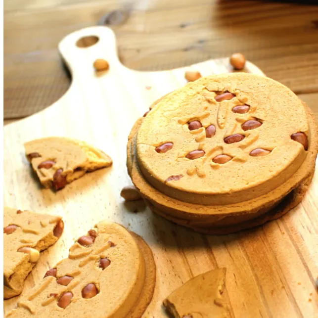 国産小麦100%を使用。小粒の落花生(南アフリカ産)を使用。 クッキー風の素朴な味わいの生地に小粒ピーナッツが味の主張をしすぎず、とても相性が良いです。 商品名の「たらちね」は母にかかる短歌の枕詞です。商品の風味・食感を母親の深い優しさ、温もり、柔らかさ等で表現し、母親の身近で深い繋がりを、商品とお客様・地域の繋がり方になぞらえて命名しました。 「高槻名物」として40年を超えて販売している月輪堂を代表する菓子です。